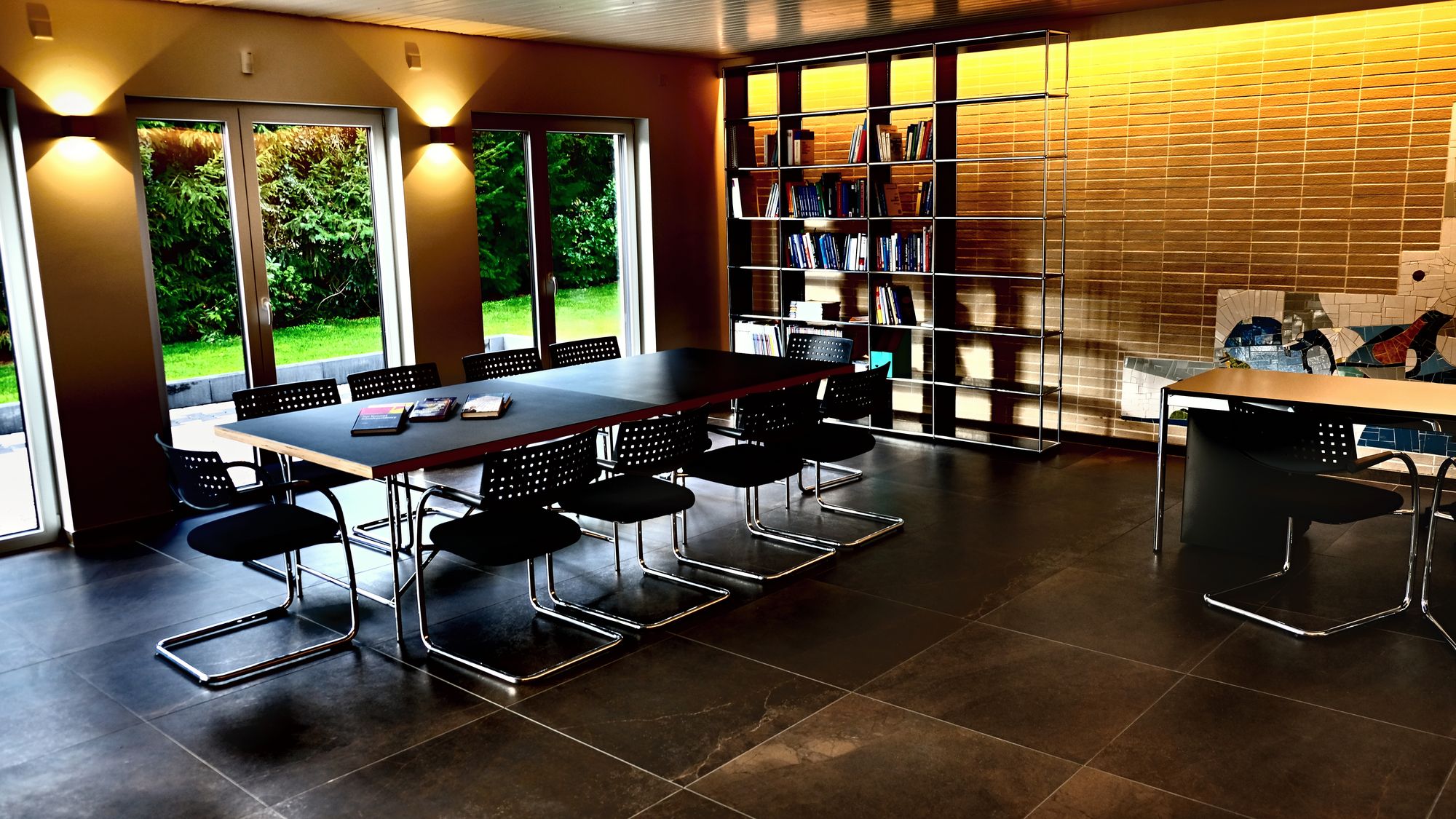 Plenar-Salon (~ 70 m² / bis 35 Pax), offenes Erdgeschoss mit Kamin, Lounge und Küche, große Terrasse mit direktem Gartenzugang.